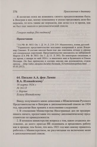 Письмо А.А. фон Лампе В.А. Иловайскому. г. Берлин, 18 марта 1924 г. // ГА РФ. Ф. 5853. Оп. 1. Д. 14. Л. 220. машинопись, копия, русский.