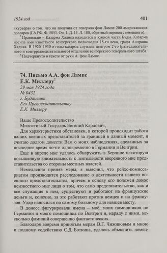 Письмо А.А. фон Лампе Е.К. Миллеру. г. Будапешт, 29 мая 1924 г. // ГА РФ. Ф. 5853. Оп. 1. Д. 15. Л. 196-199. Машинопись, копия, русский.