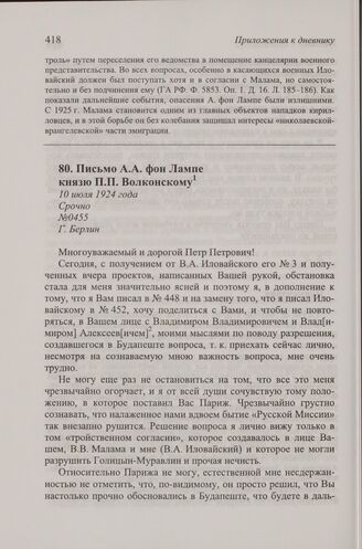 Письмо А.А. фон Лампе князю П.П. Волконскому. Г. Берлин, 10 июля 1924 г.