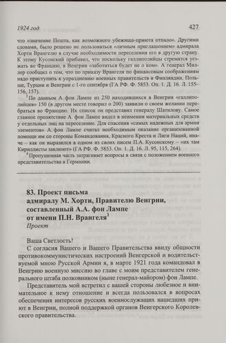 Проект письма адмиралу М. Хорти, Правителю Венгрии, составленный А.А. фон Лампе от имени П.Н. Врангеля. не позже 1 августа 1924 г. // ГА РФ. Ф. 5853. Оп. 1. Д. 16. Л. 106-107. Машинопись, копия, русский.