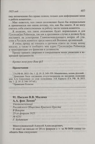 Письмо В.В. Малама А.А. фон Лампе. Г. Будапешт, 25-го февраля 1925 г. // ГА РФ. Ф. 5853. Оп. 1. Д. 19. Л. 356-357об. Машинопись, русский, оригинал.