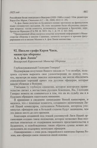 Главная Алексей фон Лампе - военный агент барона Врангеля в Венгрии Письмо графа Кароя Чаки, министра обороны A. А. фон Лампе. Будапешт...
