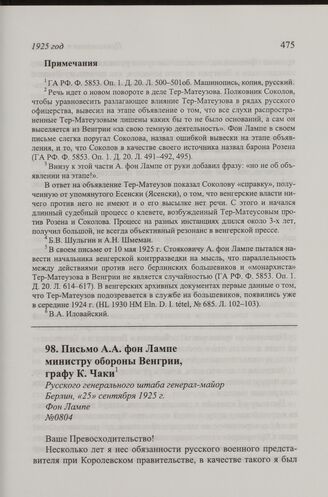 Письмо А.А. фон Лампе министру обороны Венгрии, графу К. Чаки. Берлин, 25 сентября 1925 г. // ГА РФ. Ф. 5853. Оп. 1. Д. 21. Л. 595-596. Машинопись, копия, русский.