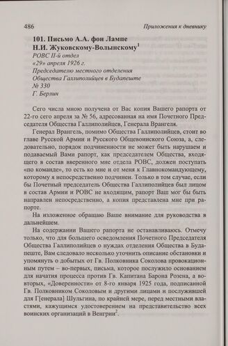 Письмо А.А. фон Лампе Н.И. Жуковскому-Волынскому. Г. Берлин, 29 апреля 1926 г. // ГА РФ. Ф. 5853. Оп. 1. Д. 25. Л. 184-185. Машинопись, копия, русский/