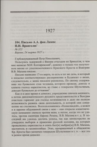 Главная Алексей фон Лампе - военный агент барона Врангеля в Венгрии Письмо А.А. фон Лампе П.Н. Врангелю. Берлин, 24 марта 1927 г.