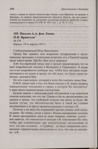 Письмо А.А. фон Лампе П.Н. Врангелю. Берлин, 19 апреля 1927 г. // ГА РФ. Ф. 5853. Оп. 1. Д. 30. Л. 120-122. Машинопись, копия, русский.