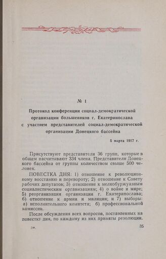 Протокол конференции социал-демократической организации большевиков г. Екатеринослава с участием представителей социал-демократической организации Донецкого бассейна. 5 марта 1917 г.