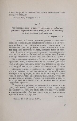 Корреспонденция в газету «Звезда» о собрании рабочих трубопрокатного завода «А» по вопросу о 8-ми часовом рабочем дне. 27 апреля 1917 г.