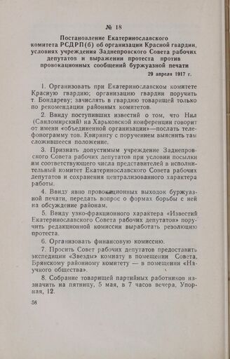 Постановление Екатеринославского комитета РСДРП(б) об организации Красной гвардии, условиях учреждения Заднепровского Совета рабочих депутатов и выражении протеста против провокационных сообщений буржуазной печати. 29 апреля 1917 г.
