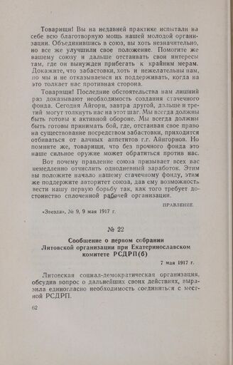 Сообщение о первом собрании Литовской организации при Екатеринославском комитете РСДРП(б). 7 мая 1917 г. // «Звезда» № 9, 9 мая 1917 г.
