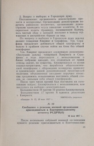 Сообщение о решении военной организации присоединиться к Екатеринославскому комитету РСДРП(б). 16 мая 1917 г. // Звезда» № 11, 16 мая 1917 г.