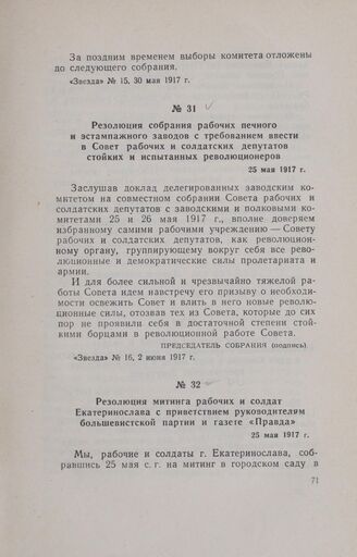 Резолюция митинга рабочих и солдат Екатеринослава с приветствием руководителям большевистской партии и газете «Правда». 25 мая 1917 г. // «Звезда» № 15, 30 мая 1917 г.