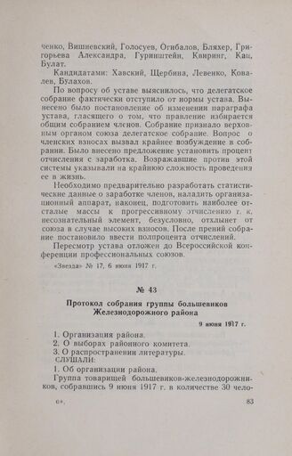 Протокол собрания группы большевиков Железнодорожного района. 9 июня 1917 г. // «Звезда» № 20, 20 июня 1917 г.
