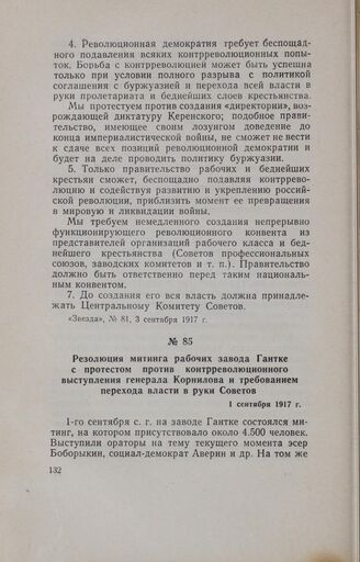 Резолюция митинга рабочих завода Гантке с протестом против контрреволюционного выступления генерала Корнилова и требованием перехода власти в руки Советов. 1 сентября 1917 г. // «Звезда», № 82, 4 сентября 1917 г.