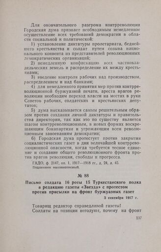 Письмо солдата 16 роты 15 Туркестанского полка в редакцию газеты «Звезда» с протестом против присылки на фронт буржуазных газет. 3 сентября 1917 г.