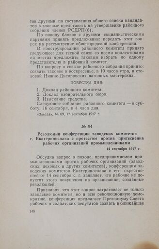 Резолюция конференции заводских комитетов г. Екатеринослава с протестом против притеснения рабочих организаций промышленниками. 14 сентября 1917 г.