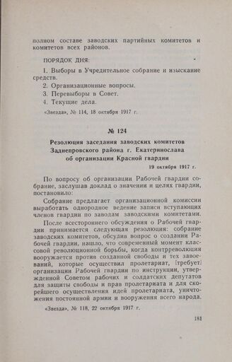 Резолюция заседания заводских комитетов Заднепровского района г. Екатеринослава об организации Красной гвардии. 19 октября 1917 г. // «Звезда», № 118, 22 октября 1917 г.