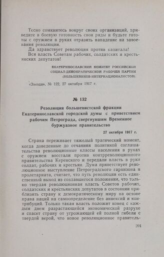 Резолюция большевистской фракции Екатеринославской городской думы с приветствием рабочим Петрограда, свергнувшим Временное буржуазное правительство. 27 октября 1917 г.