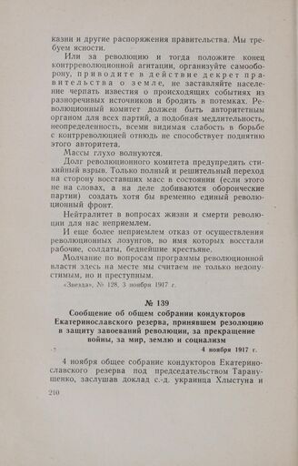 Сообщение об общем собрании кондукторов Екатеринославского резерва, принявшем резолюцию в защиту завоеваний революции, за прекращение войны, за мир, землю и социализм. 4 ноября 1917 г. // «Звезда», № 130, 7 ноября 1917 г.
