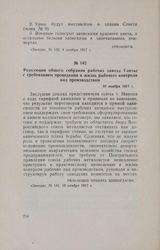 Резолюция общего собрания рабочих завода Гантке с требованием проведения в жизнь рабочего контроля над производством. 10 ноября 1917 г. // «Звезда», № 141, 18 ноября 1917 г.