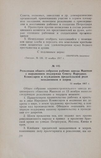 Резолюция общего собрания рабочих завода Мантеля с выражением поддержки Совету Народных Комиссаров и осуждением предательской роли меньшевиков и эсеров. 13 ноября 1917 г.