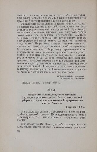 Резолюция съезда депутатов крестьян Верхнеднепровского уезда, Екатеринославской губернии с требованием созыва Всеукраинского съезда Советов. 3 декабря 1917 г. // «Звезда», № 156, 9 декабря 1917 г.