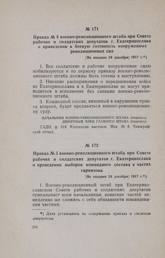 Приказ № 5 военно-революционного штаба при Совете рабочих и солдатских депутатов г. Екатеринослава о проведении выборов командного состава в частях гарнизона. [Не позднее 24 декабря] 1917 г. // ГАДО, ф. 614. Коллекция листовок. Инв. № 9. Типографский оттиск.