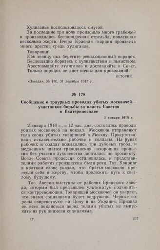 Сообщение о траурных проводах убитых москвичей — участников борьбы за власть Советов в Екатеринославе. 2 января 1918 г. // «Звезда», № 171, 3 января 1918 г.