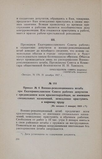 Приказ № 6 Военно-революционного штаба при Екатеринославском Совете рабочих депутатов с предписанием всем красногвардейцам, не имеющим специальных назначений, немедленно приступить к мирному труду. [Не позднее 2 января] 1918 г.