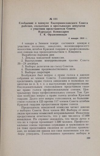 Сообщение о пленуме Екатеринославского Совета рабочих, солдатских и крестьянских депутатов с участием представителя Совета Народных Комиссаров Г. К. Орджоникидзе. 4 января 1918 г.
