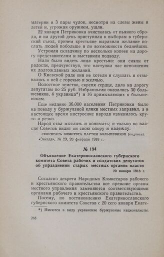 Объявление Екатеринославского губернского комитета Совета рабочих и солдатских депутатов об упразднении старых местных органов власти. 20 января 1918 г. // «Известия Екатеринославского Совета рабочих, солдатских и крестьянских депутатов», № 5, 16 февраля 1918 г.