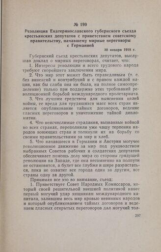 Резолюция Екатеринославского губернского съезда крестьянских депутатов с приветствием советскому правительству, начавшему мирные переговоры с Германией. 30 января 1918 г. // «Звезда», № 26, 15 февраля 1918 г.