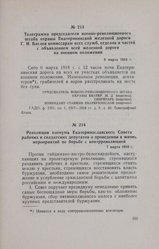 Телеграмма председателя военно-революционного штаба охраны Екатерининской железной дороги Г. Н. Баглея комиссарам всех служб, отделов и частей с объявлением всей железной дороги на военном положении. 6 марта 1918 г. // ГАДО, ф. 2151, оп. 1, 1917—1918 гг., д. 8, л. 46. Телеграфный бланк.