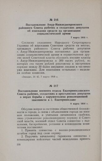 Постановление Амур-Нижнеднепровского районного Совета рабочих и солдатских депутатов об изыскании средств на организацию социалистической армии. 7 марта 1918 г. // «Звезда», № 42, 7 марта 1918 г.