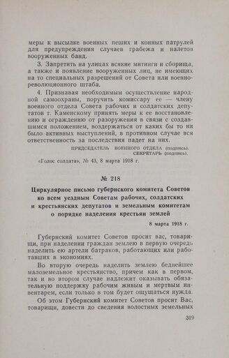 Циркулярное письмо губернского комитета Советов ко всем уездным Советам рабочих, солдатских и крестьянских депутатов и земельным комитетам о порядке наделения крестьян землей. 8 марта 1918 г. // «Голос солдата», № 43, 8 марта 1918 г.