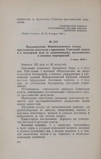 Постановление Новомосковского съезда крестьянских депутатов о признании Советской власти и о поддержке всех ее экономических, политических и военных мероприятий. 8 марта 1918 г. // «Голос солдата», № 43, 8 марта 1918 г.