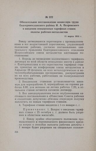 Обязательное постановление комиссара труда Екатеринославского района И. А. Петровского о введении повышенных тарифных ставок оплаты рабочих-металлистов. 11 марта 1918 г. // «Известия Каменского Совета рабочих депутатов», № 25, 28 марта 1918 г.