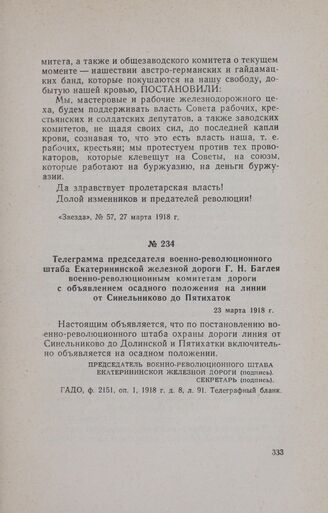 Телеграмма председателя военно-революционного штаба Екатерининской железной дороги Г. Н. Баглея военно-революционным комитетам дороги с объявлением осадного положения на линии от Синельниково до Пятихаток. 23 марта 1918 г.