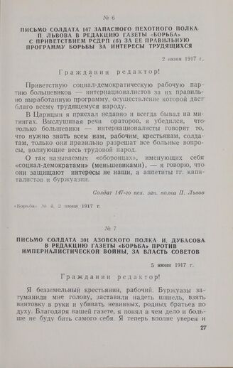Письмо солдата 301 Азовского полка И. Дубасова в редакцию газеты «Борьба» против империалистической войны, за власть Советов. 5 июня 1917 г. // «Борьба» № 5, 5 июня 1917 г.