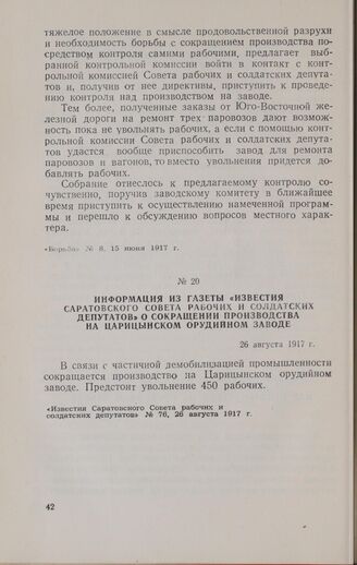 Информация из газеты «Известия Саратовского Совета рабочих и солдатских депутатов» о сокращении производства на Царицынском Орудийном заводе. 26 августа 1917 г. // «Известия Саратовского Совета рабочих и солдатских депутатов» № 76, 26 августа 1917 г.