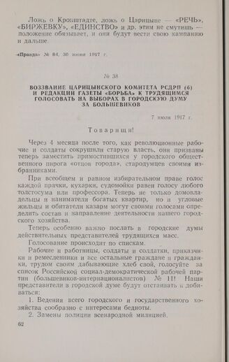 Воззвание Царицынского комитета РСДРП(б) и редакции газеты «Борьба» к трудящимся голосовать на выборах в городскую думу за большевиков. 7 июля 1917 г. // «Борьба» № 21, 7 июля 1917 г.