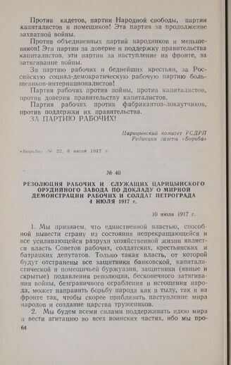 Резолюция рабочих и служащих Царицынского Орудийного завода по докладу о мирной демонстрации рабочих и солдат Петрограда 4 июля 1917 г. 10 июля 1917 г.
