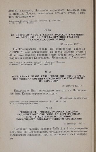 Из книги «1917 г. в Сталинградской губернии» об организации отряда Красной гвардии на Французском заводе. 30 августа 1917 г. // «1917 год в Сталинградской губернии». Хроника событий. Сталинград. 1927 г., стр. 90