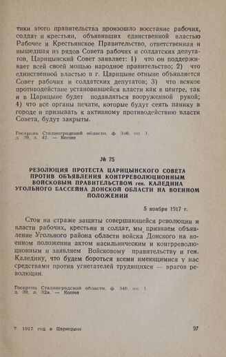Резолюция протеста Царицынского Совета против объявления контрреволюционным войсковым правительством ген. Каледина угольного бассейна Донской области на военном положении. 5 ноября 1917 г.