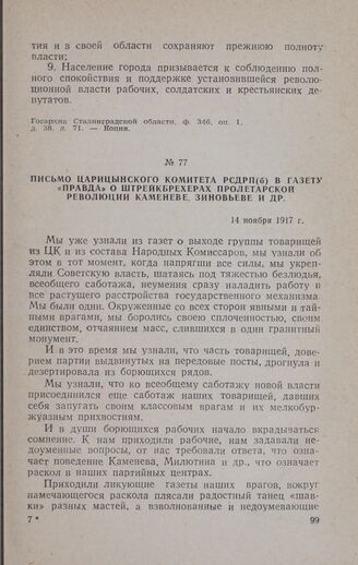 Письмо Царицынского комитета РСДРП(б) в газету «Правда» о штрейкбрехерах пролетарской революции Каменеве, Зиновьеве и др. 14 ноября 1917 г.