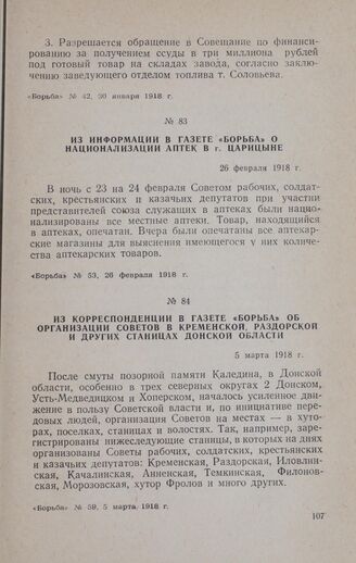 Из корреспонденции в газете «Борьба» об организации Советов в Кременской, Раздорской и других станицах Донской области. 5 марта 1918 г.