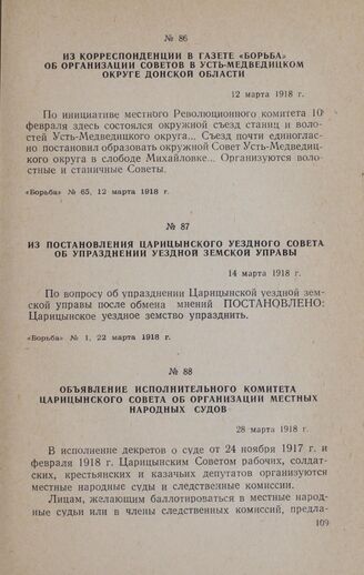 Из корреспонденции в газете «Борьба» об организации Советов в Усть-Медведицком округе Донской области. 12 марта 1918 г. // «Борьба» № 65, 12 марта 1918 г.
