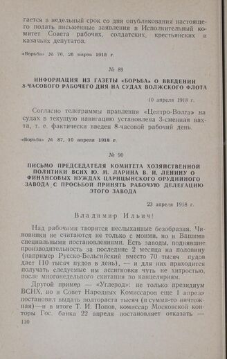 Письмо председателя Комитета хозяйственной политики ВСНХ Ю. М. Ларина В. И. Ленину о финансовых нуждах Царицынского Орудийного завода с просьбой принять рабочую делегацию этого завода. 23 апреля 1918 г.