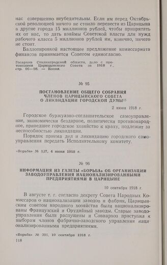 Информация из газеты «Борьба» об организации заводоуправления национализированными предприятиями в Царицыне. 10 сентября 1918 г. // «Борьба» № 205, 10 сентября 1918 г.