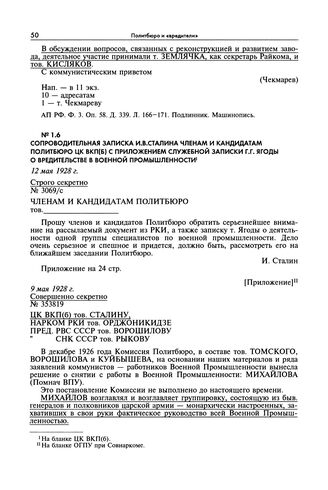 Сопроводительная записка И.В. Сталина членам и кандидатам Политбюро ЦК ВКП(б) с приложением служебной записки Г.Г. Ягоды о вредительстве в военной промышленности. 12 мая 1928 г.
